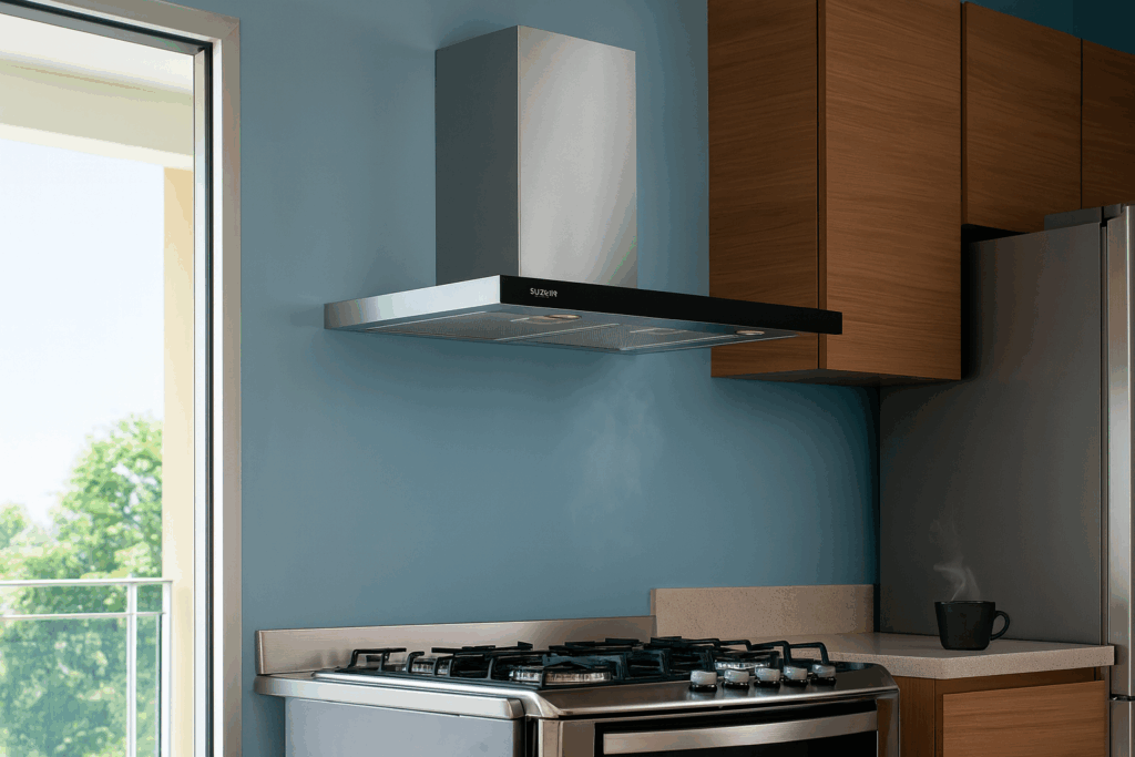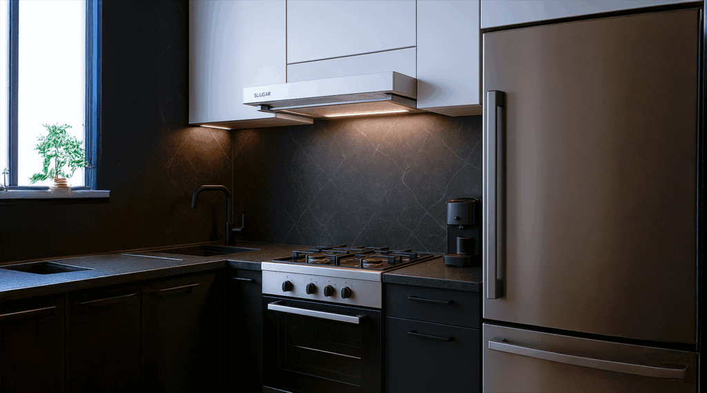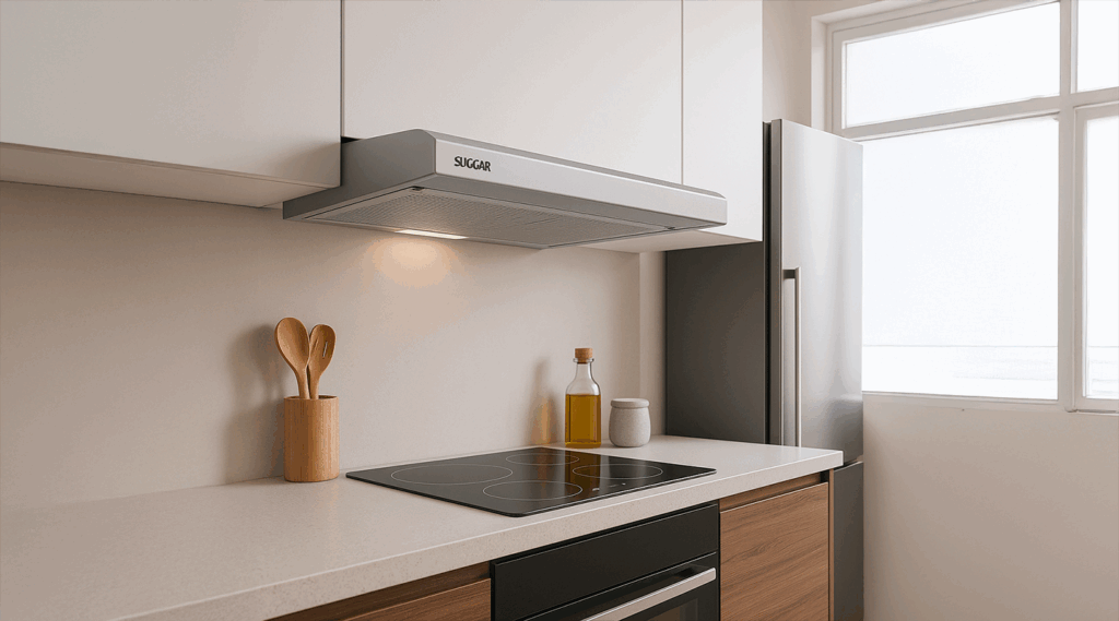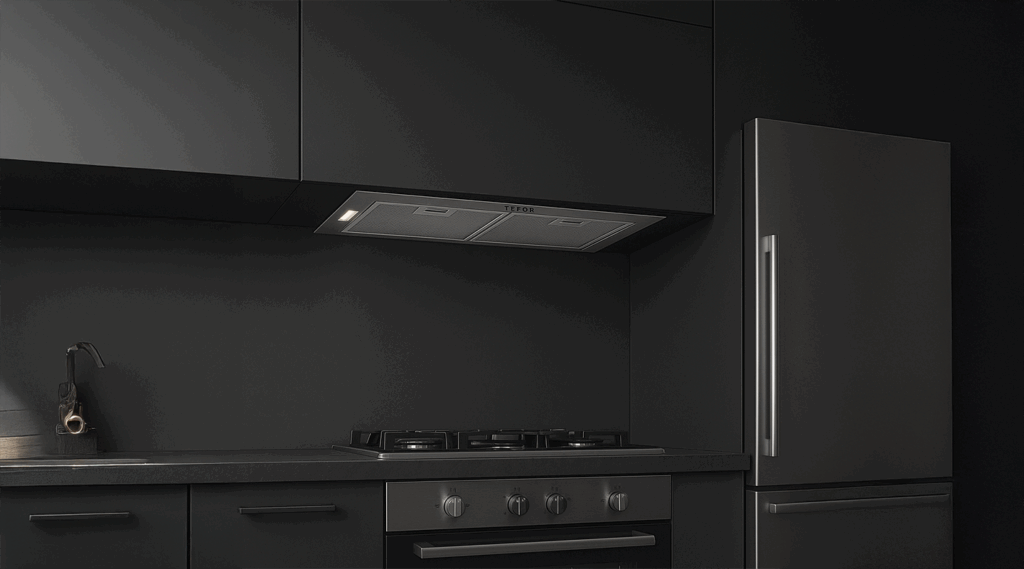 Compacto e funcional, é ideal para cozinhas pequenas. Embutido nos armários, preserva espaço e garante boa filtragem do ar.