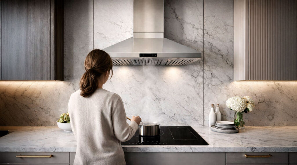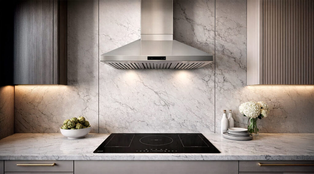 A Coifa de Parede Evol Ômega Smart 75 cm Inox se integra ao Cooktop de Indução Evol Smart 5 Bocas 90 cm, dessa forma: