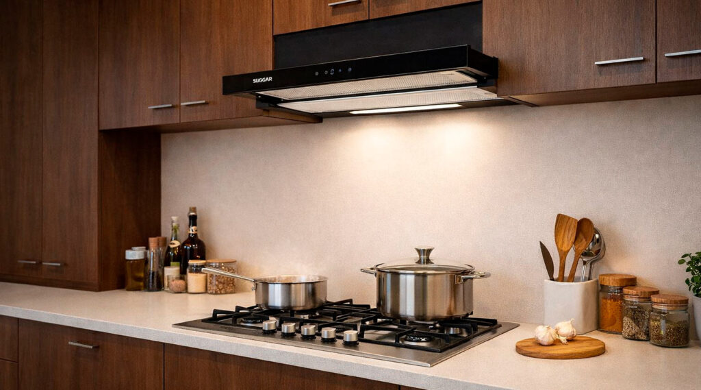 Alta capacidade de sucção e filtros metálicos laváveis. Além disso, o design embutido garante eficiência com visual discreto.